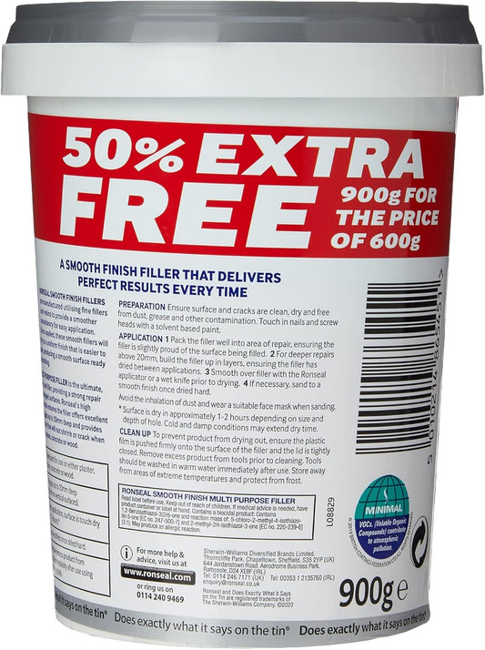 Ronseal 6886271-HHW Smooth Finish Filler Multi-Purpose Ready Mixed 900g, White