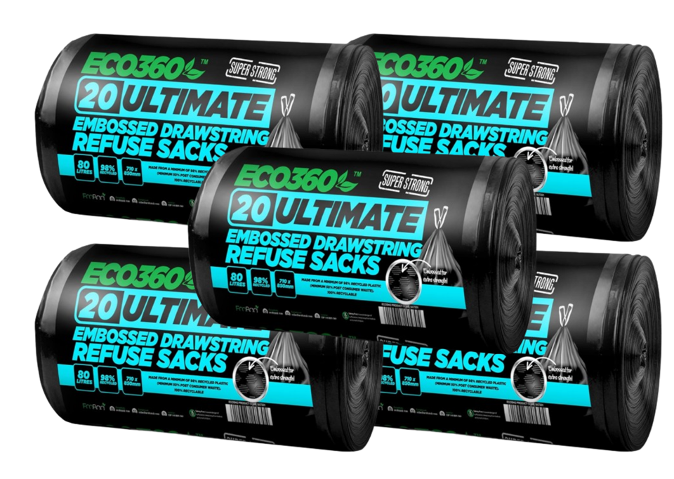 20-Pack Ultimate Embossed Black Drawstring Bin Liner Bin Bag Refuse Sacks Heavy Duty - 80L Capacity | Made from 98% Recycled Material | 100% Recyclable