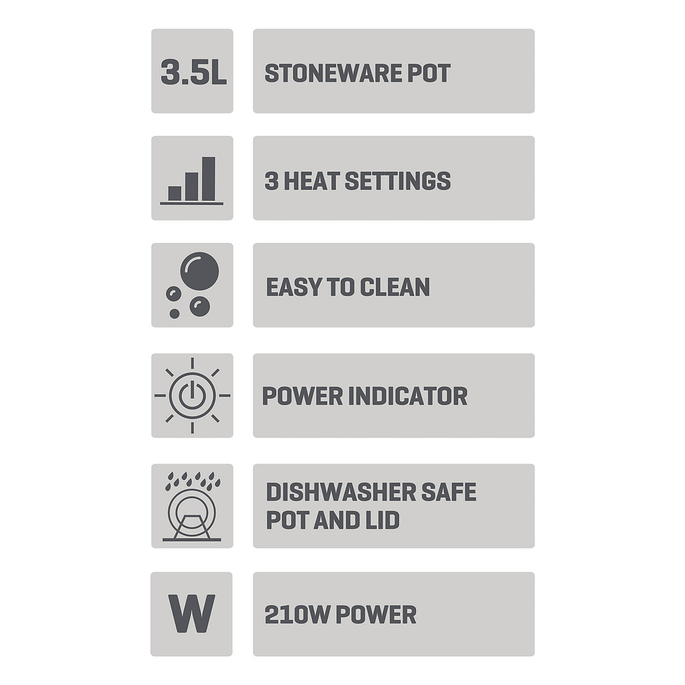 Using less energy than other cooking methods, this 210w slow cooker is ideal for bringing down costs and making piping hot meals. Featuring a handy indicator light so that you can see the status of the cooker at all times, and a large 3.5 litre capacity. You won't have to spend a long time cleaning up either as the pot and lid are both dishwasher safe, making cleaning up after cooking quick and easy