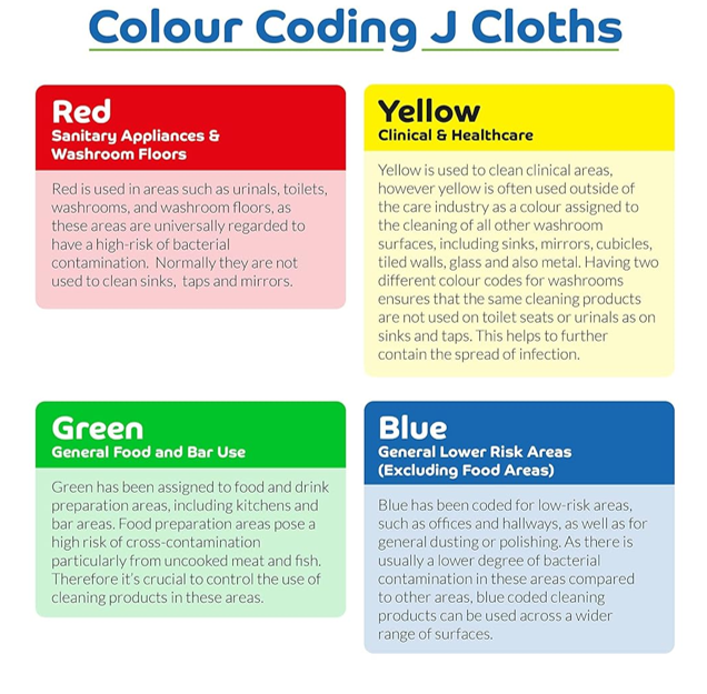 These large, heavy duty cloths are tough enough for a variety of cleaning tasks. Extra hygienic, heavy weighted {0.35g} and come in easy colour-coded system. They can be laundered and re-used as required and are ideal for healthcare and food environments.