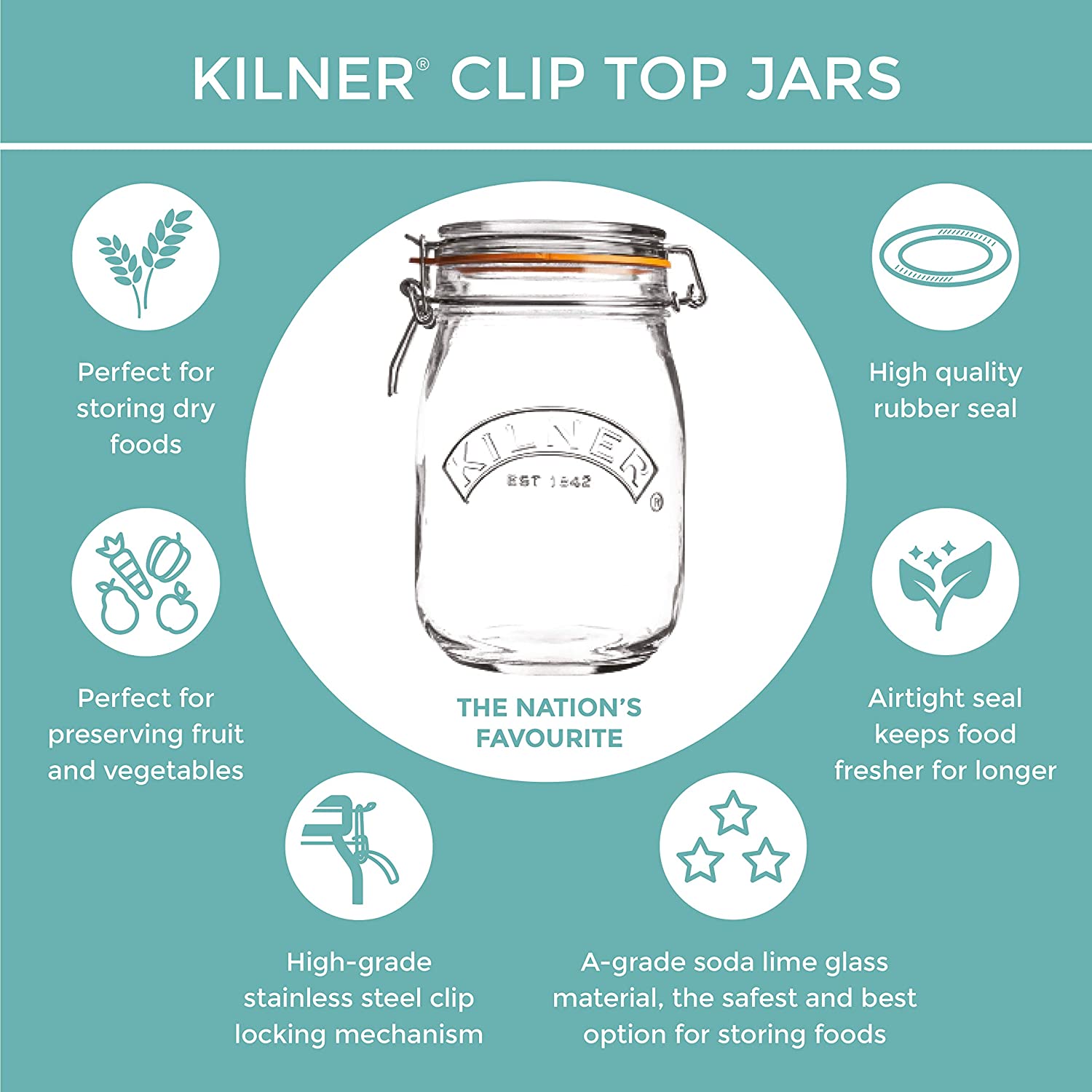 - ROUND CLIP TOP JAR | The Kilner Clip Top Jar is ideal for preserving healthy, homegrown foods, the contemporary round jar shape is space saving making it ideal for pantry storage, each jar embodies the traditional Kilner styling with the authentic embossed logo and contains a detailed instruction leaflet inside