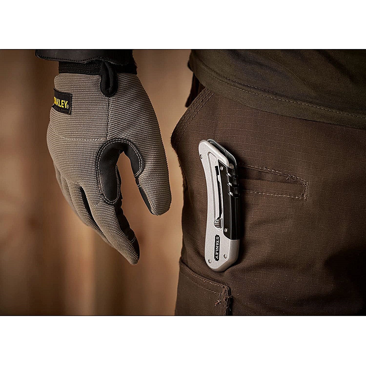 The Stanley FatMax Retractable is an all metal safety knife. With all metal construction and tool free blade change design. This pocket sized knife is quick and easy to use one handed, with its simple but effective blade slider. The push down and slide safety feature, ensures that the blade is not accidentally extended. Pocket sized for convenience and easy to carry with its metal belt clip.