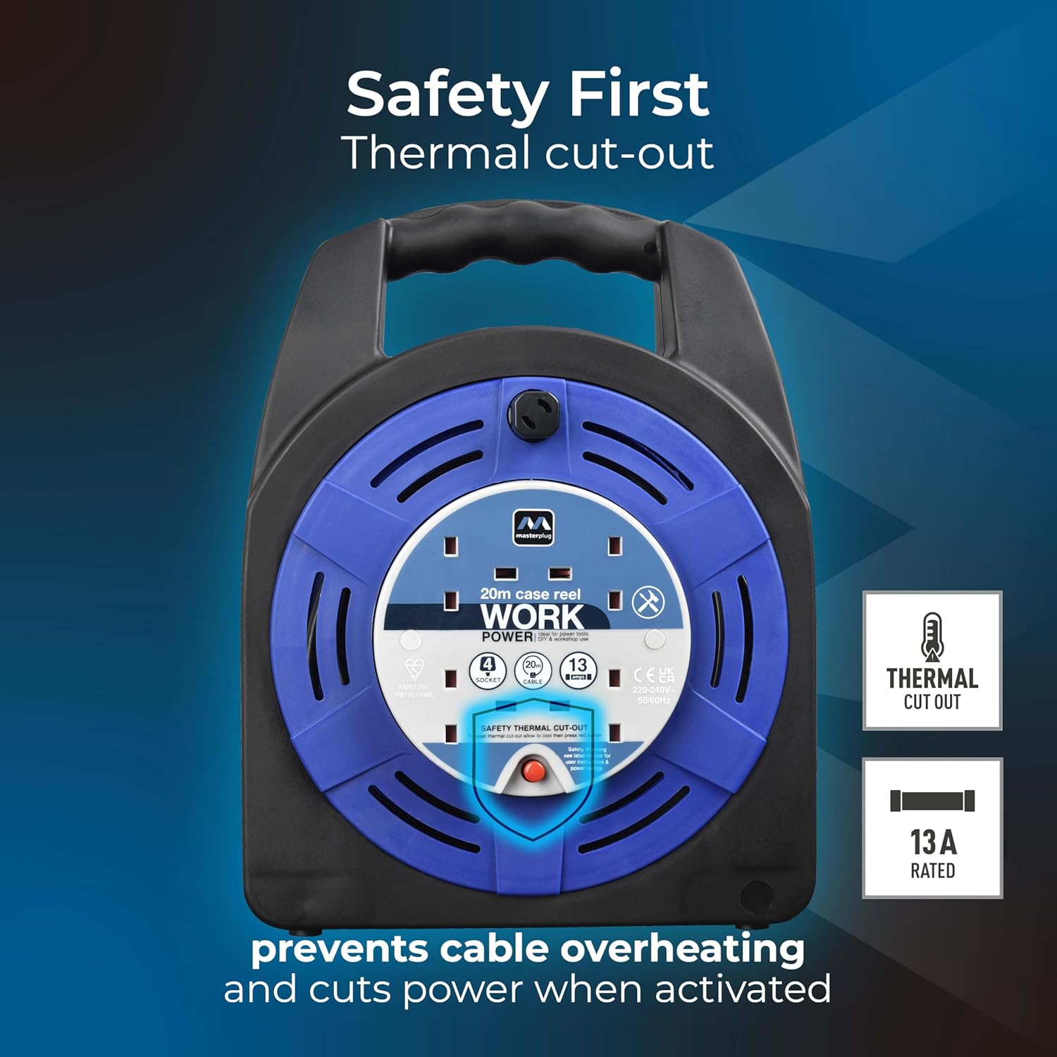 • A LARGE 13A CASE REEL WITH ROBUST DESIGN: From Masterplug's Work Power range, an impact-resistant drum offers a versatile power access solution. It's ideal for home, DIY and light industrial use. A flat base enables the cable reel to stand upright.
