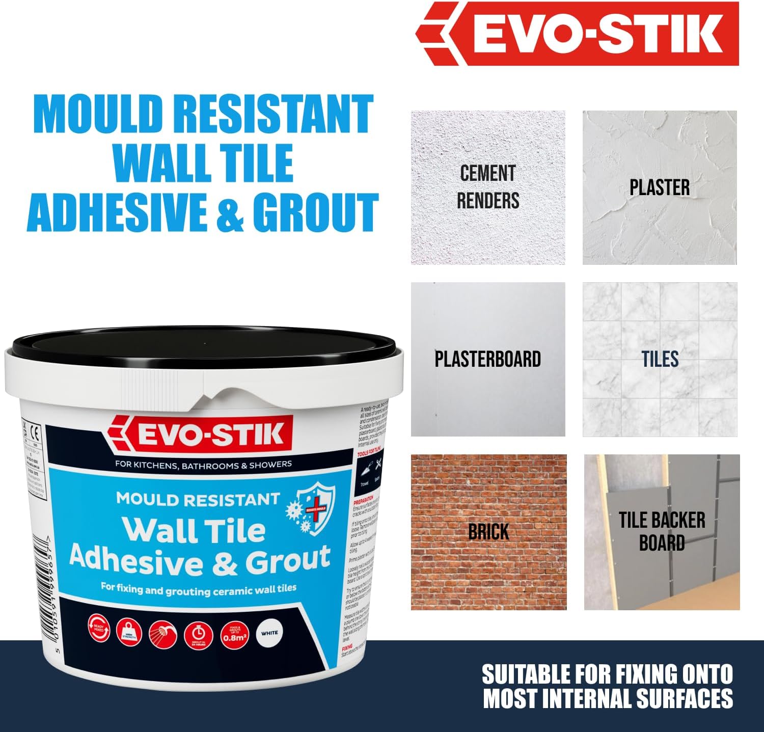 EVO-STIK Mould Resistant Wall Tile Adhesive & Grout is an easy-to-use, ready-mixed wall tile adhesive and grout for all sizes of ceramic tiles, fixing the tiles in place as well as sealing them.