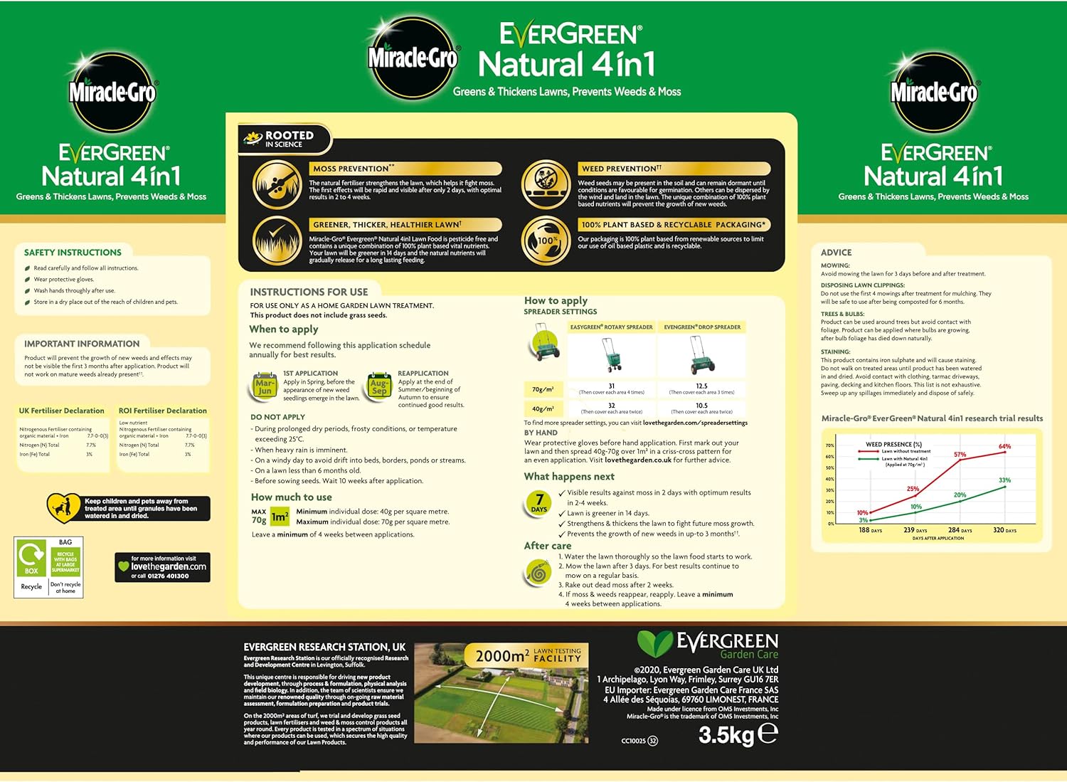 Greener, thicker, healthier lawn: Miracle-Gro Evergreen Natural 4 in 1 Lawn Food is pesticide free and contains a unique combination of 100% plant based vital nutrients. Your lawn will be greener in 14 days and the natural nutrients will gradually release for a long lasting feeding.