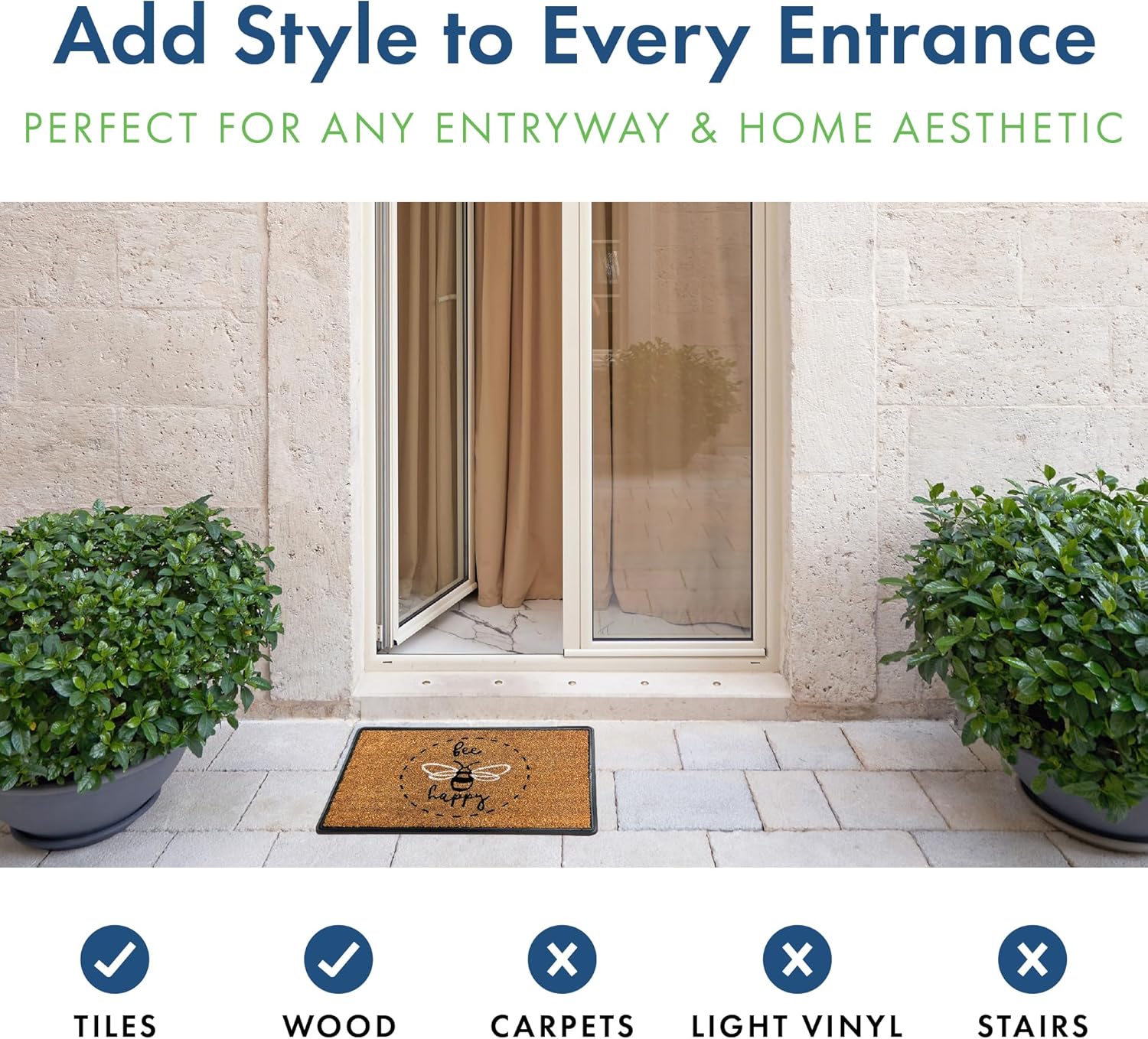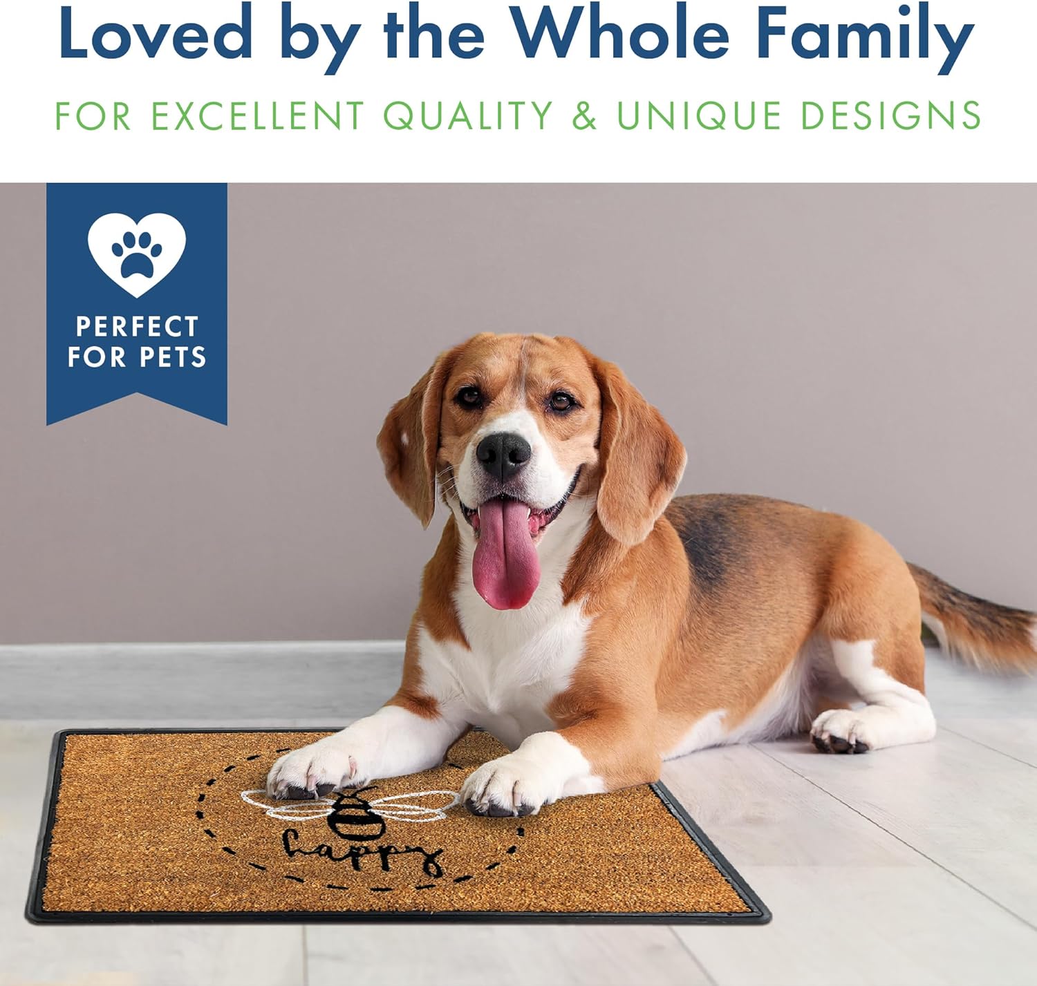 Rubber Coir Tray Door Mat - Dirt Scraping Anti-Slip Front Door Rug for Sheltered Outdoor Areas with Durable Rubber Backing - Versatile Door Carpet - Bee Happy, 40 x 60cm