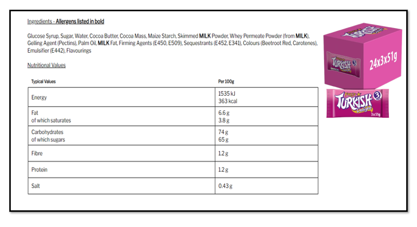 Exquisitely sweet rose flavoured Turkish delight wrapped in smooth milk chocolate. Fry's Turkish Delight Multipack contains 3 bars. 24 x 3 x 51g