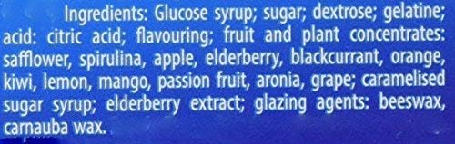 Glucose Syrup, Sugar, Dextrose, Gelatine, Acid: Citric Acid, Flavouring, Fruit and Plant Concentrates: Safflower, Spirulina, Apple, Elderberry, Blackcurrant, Orange, Kiwi, Lemon, Mango, Passion Fruit, Aronia, Grape, Caramelised Sugar Syrup, Elderberry Extract, Glazing Agents: Beeswax, Carnauba Wax