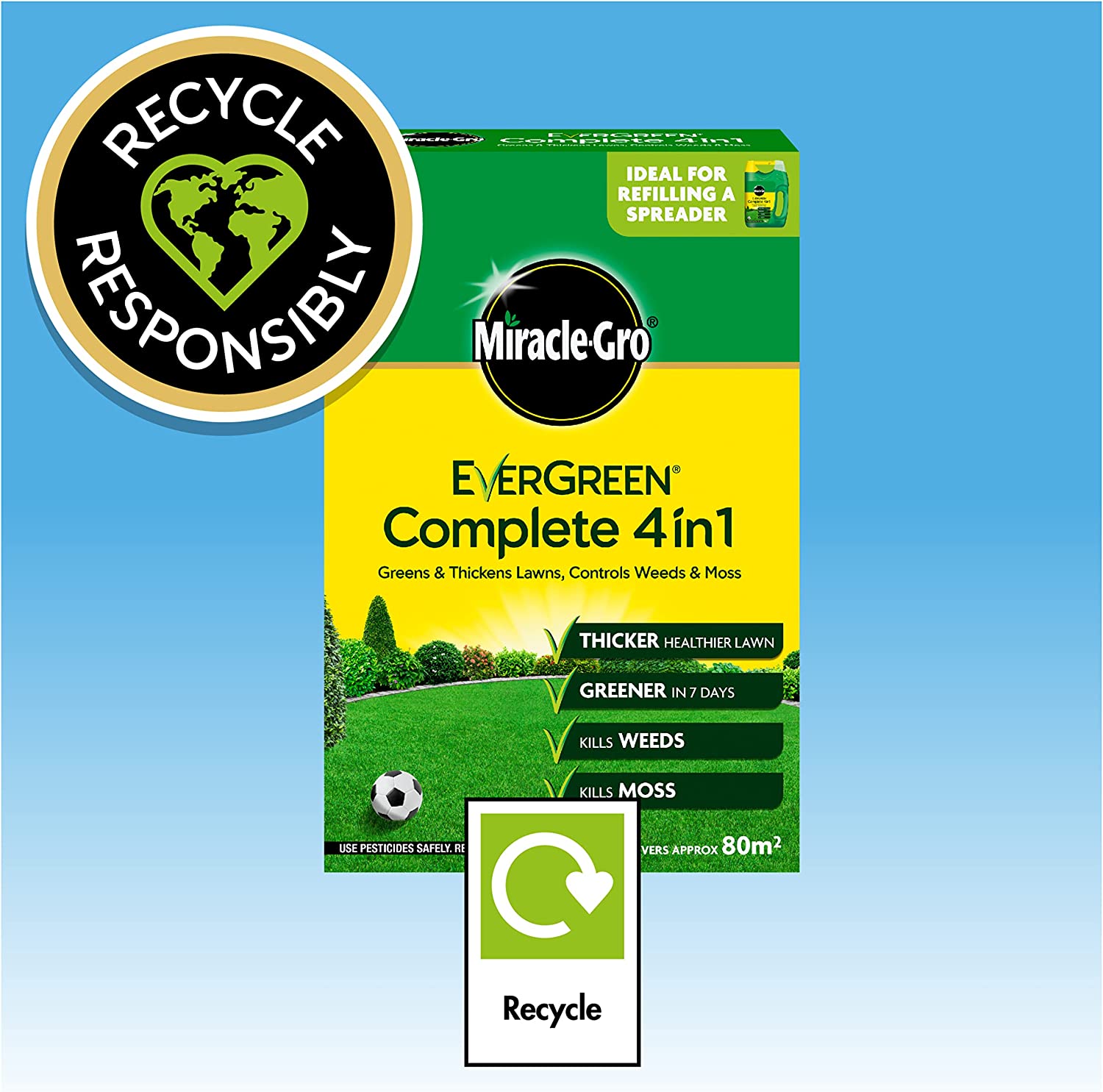 Miracle Gro Evergreen Complete is the perfect feed for your lawn. Apply to lawns between April and September and when the weather is fair, the soil is moist and the grass dry and frost free.
