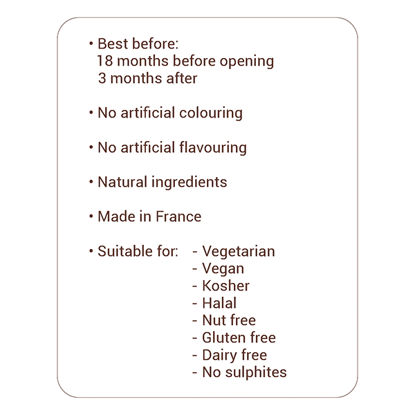 - Suitable for vegan, vegetarian diets. Alcohol-free, Halal, Kosher. Natural flavourings.