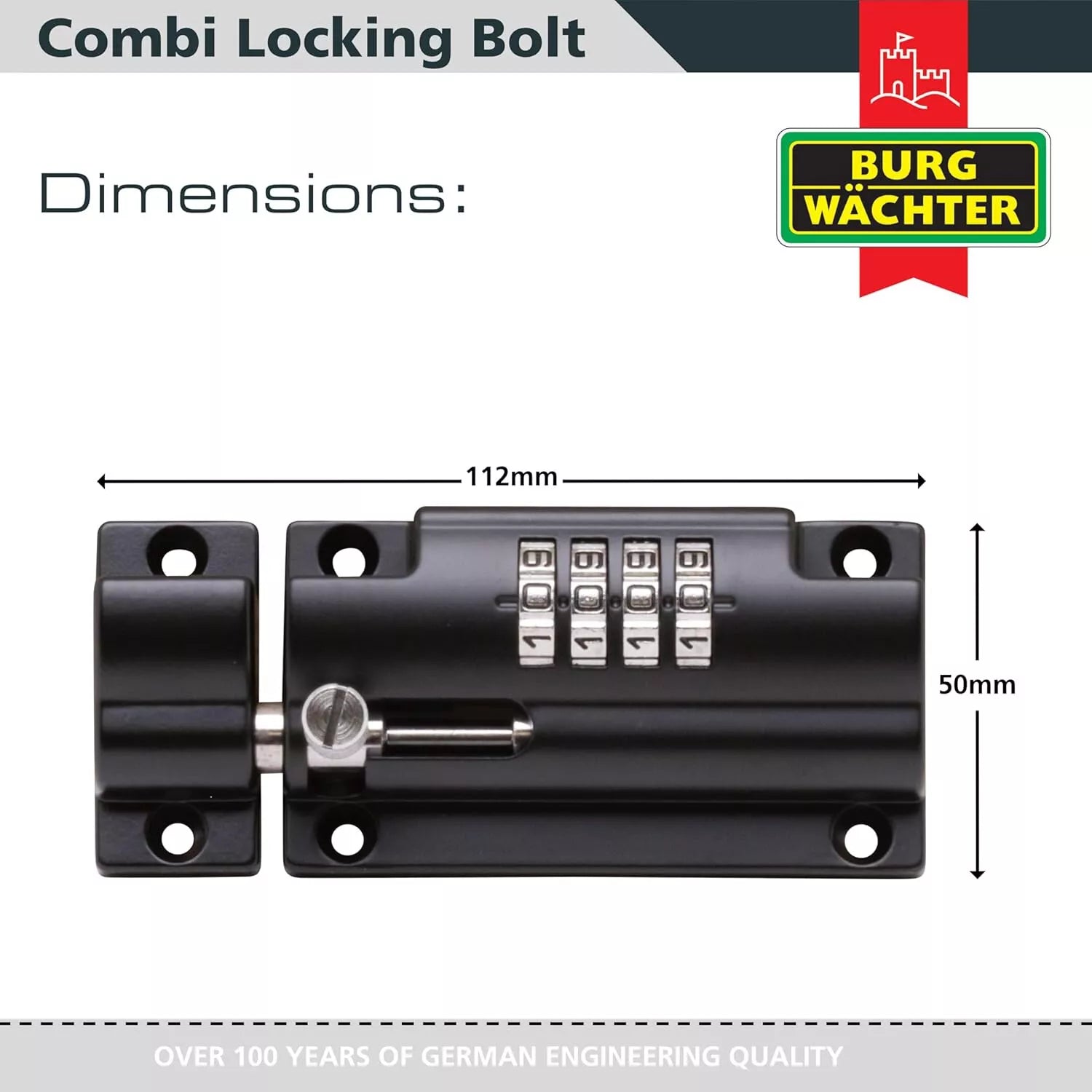 The Burg Wachter CLB110BK110mm combination locking bolt is suitable for use on Gates, Sheds, Doors and Cupboards. This award winning product can be fixed in either a horizontal or vertical position.