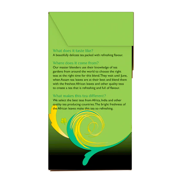 Light & Refreshing. Sourced with Care. What does it taste like? A beautifully delicate tea packed with refreshing flavour. Where does it come from? Our master blenders use their knowledge of tea gardens from around the world to choose the right teas at the right time for this blend. They wait until June, when Assam tea leaves are at their best and blend them with the freshest African leaves and other quality teas to create a tea that is refreshing and full of flavour. What makes this tea different? We select the best teas from Africa, India and other quality tea producing countries. The bright freshness of the African leaves make this tea so refreshing.