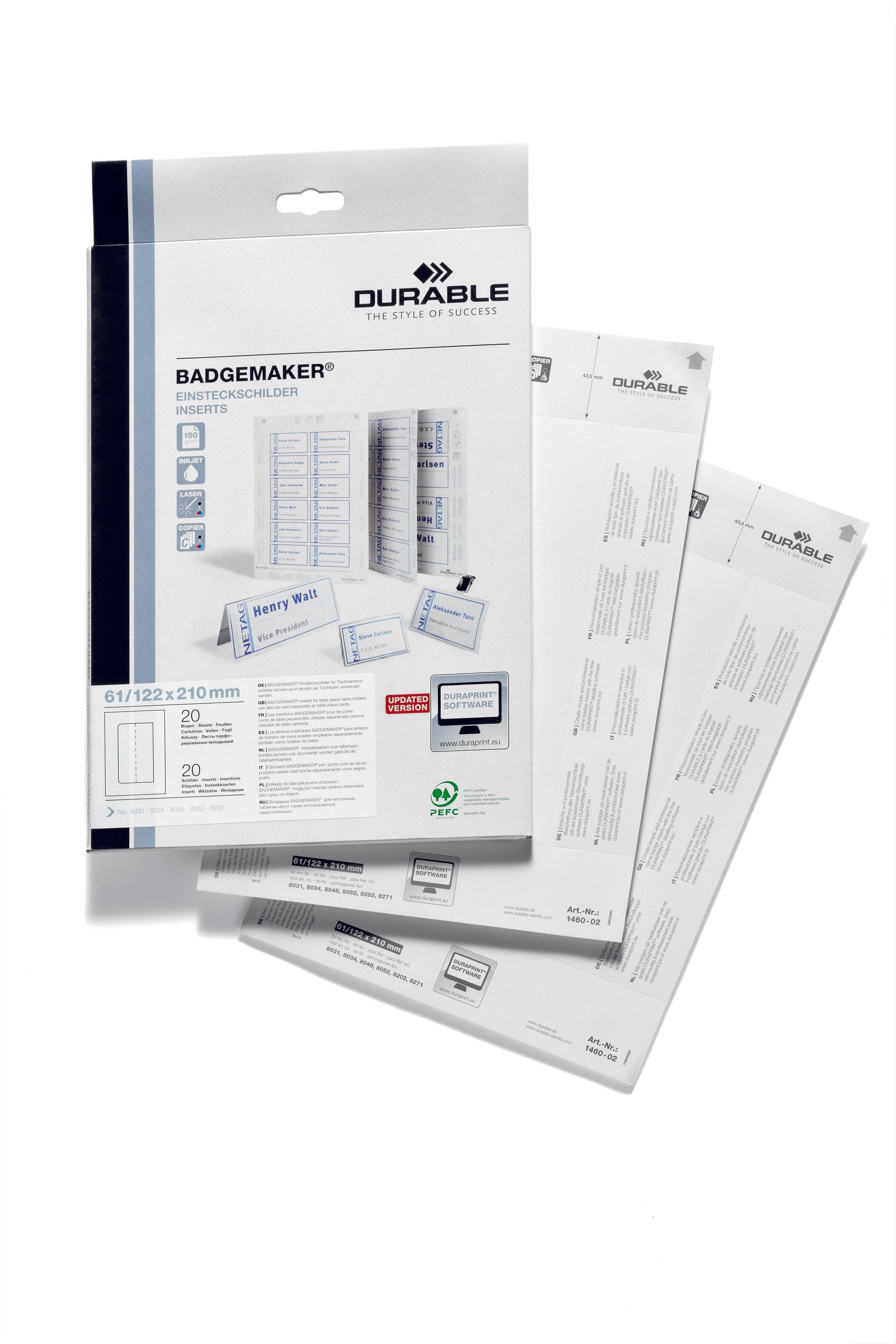 PC Printable Place Name Holder insert sheets, available in a range of sizes to fit most size place name holders. A4 sheets are micro-perforated for easy separation and smooth edges. Quality printing results are given on all laser inkjet and dot matrix printers. Create professional badge inserts using Duraprint online the free design programme available from the Durable website: www.durable-uk.com.