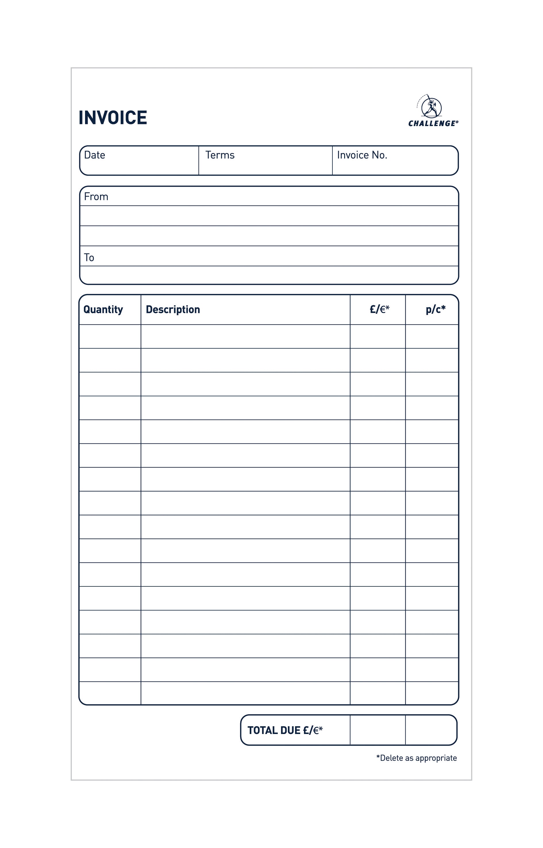 This Challenge Invoice Book without VAT column provides carbonless duplicate copies for your records. Each book is tape bound and contains 100 numbered sets of duplicates. This pack contains 5 duplicate invoice books measuring 210 x 130mm.