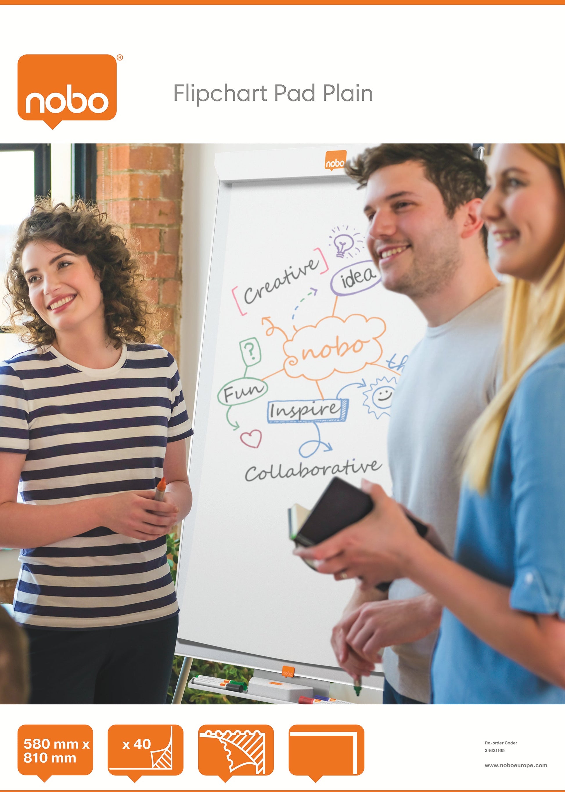 Flipchart pads are ideal for capturing information and ideas. Plain paper, 60 gsm TMP paper, 40 sheets. Size: 580x810mm