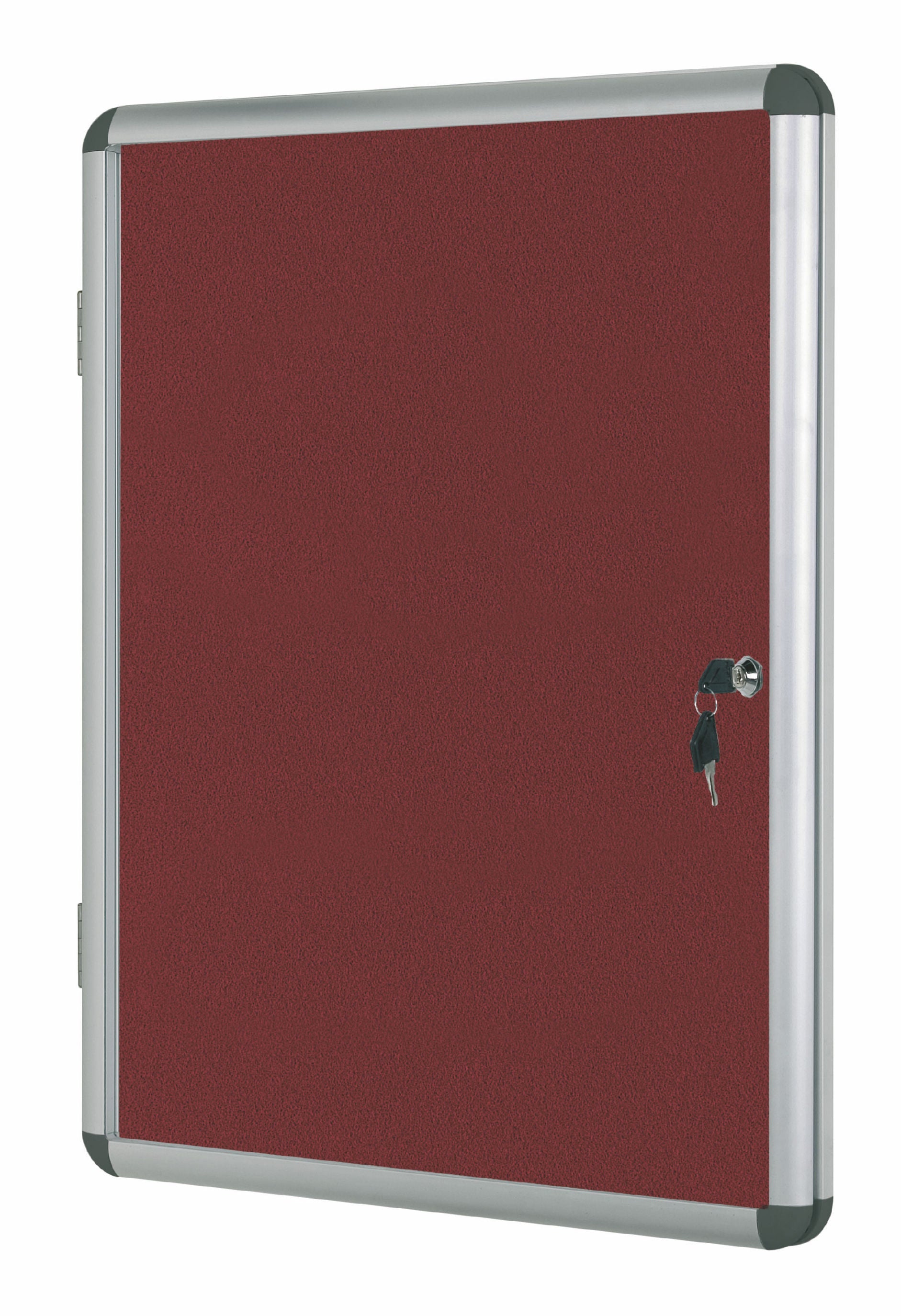 An aluminium indoor lockable notice board with felt surface, ideal to display important messages in corridors, schools or common areas. This display case conveniently locks to protect your messages and info from hampering or manipulation. Its smooth burgundy felt surface allows the use of push pins or hook and loop strips.