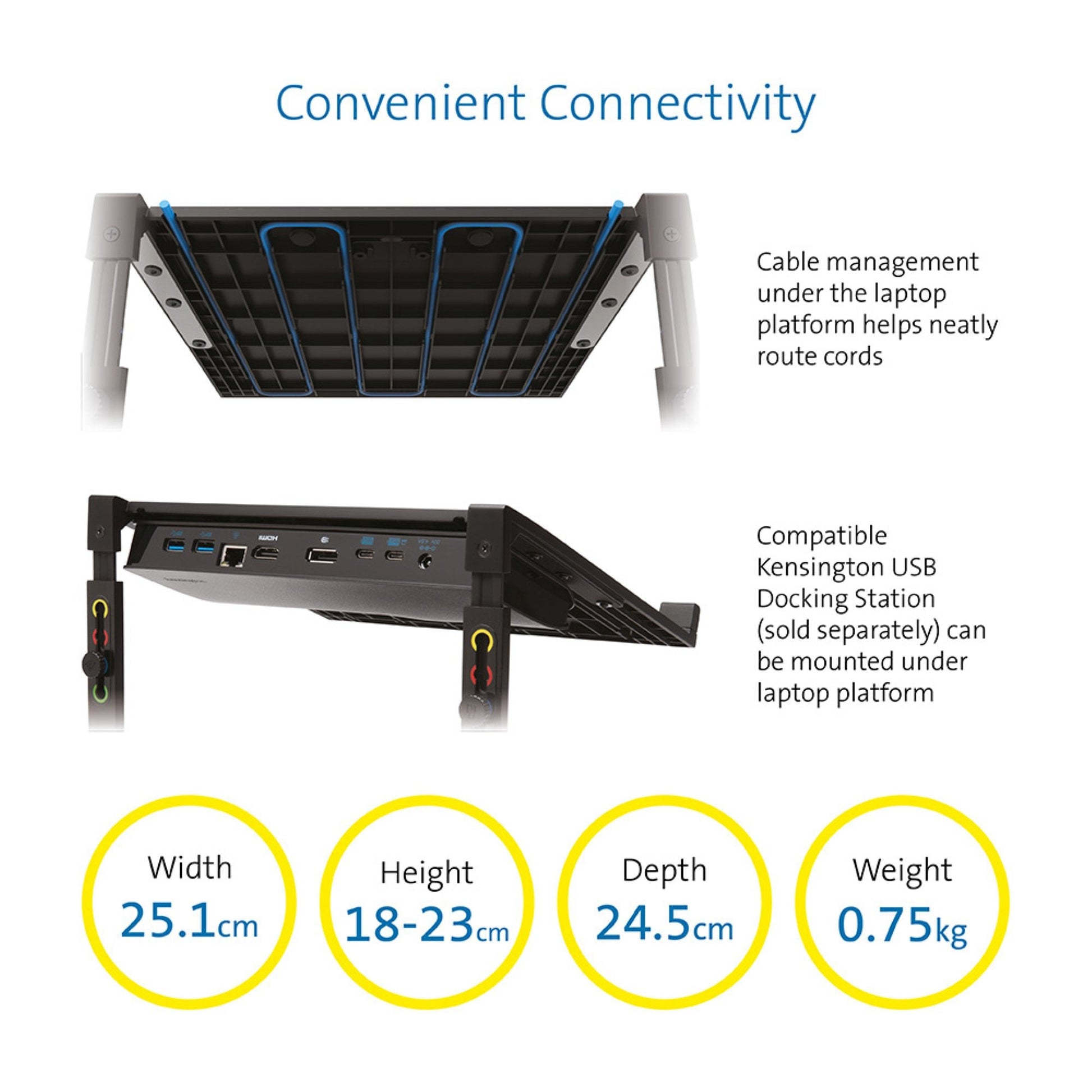 - • Zero footprint - allows you to mount a compatible Kensington universal docking stations under the platform, which is ideal for desktops with limited space