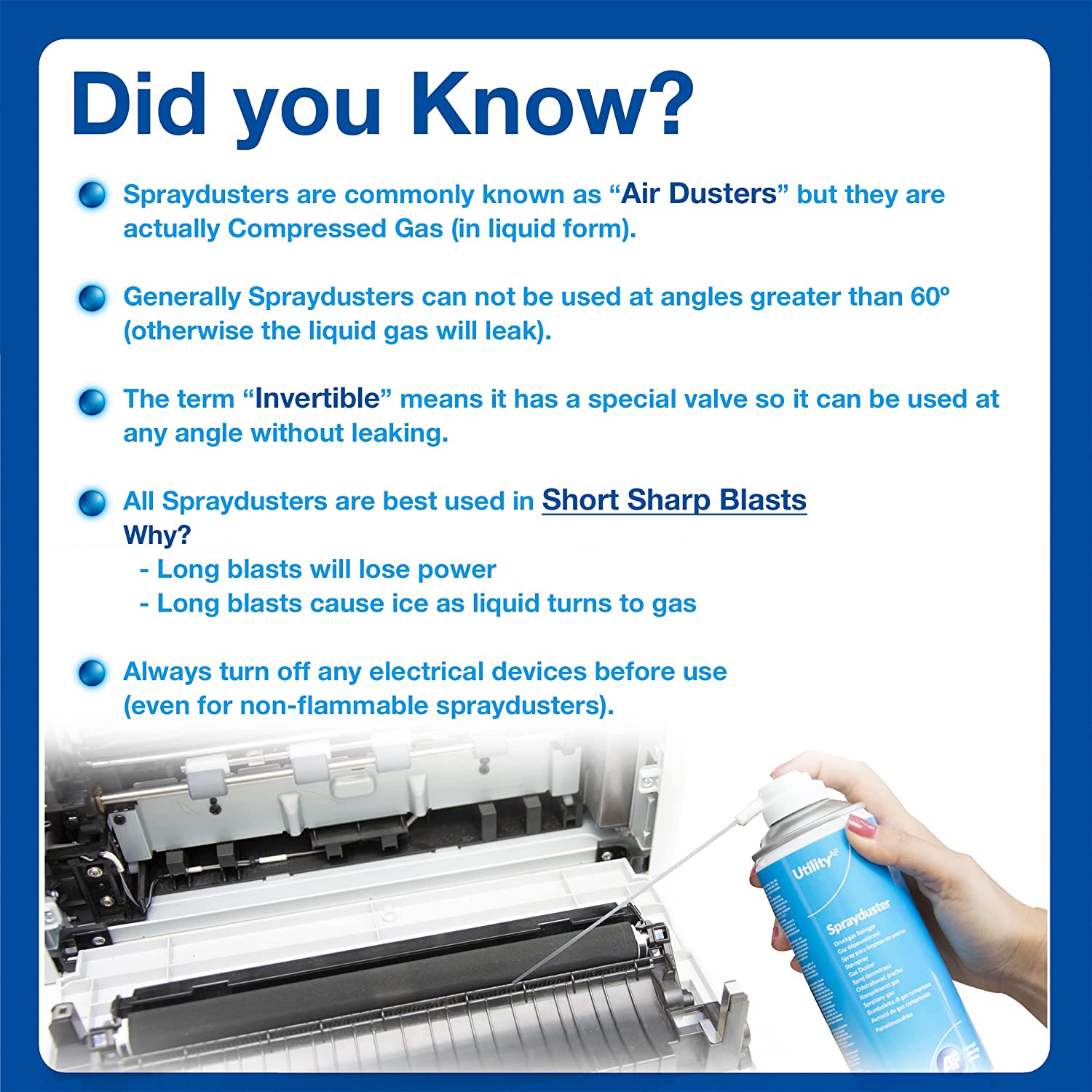 An economy Non-invertible flammable sprayduster, ideal for cleaning dust and dirt from inaccessible or hard to reach areas. Can be used at any angle. Not to be used near heat and live equipment must be powered down before cleaning. Use only as directed.