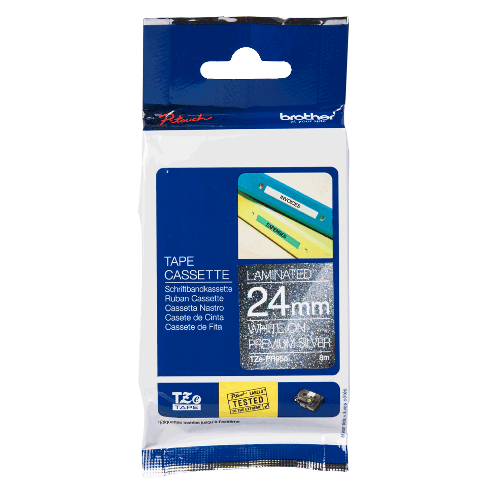 Genuine replacement TZe-PR955 premium labelling tape. Its sparkling silver coloured background gives a premium feel to name badges, signs, and makes it a great addition to customise your crafts, cards and gifts. Its laminated overcoat ensures that your labels will be well protected from damage. Compatible with P-touch label printers that show the TZ or TZe logo.